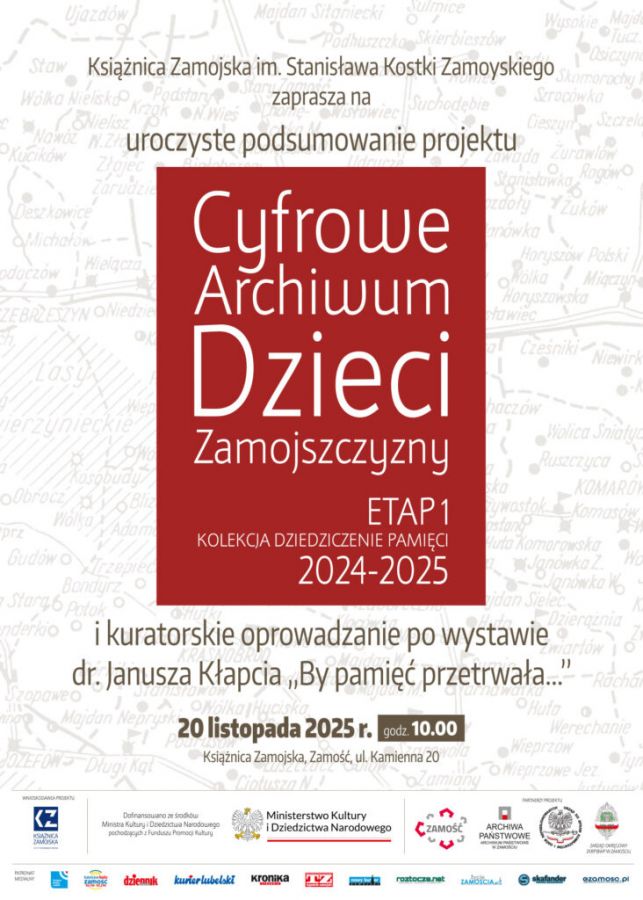 dodano: 20.11.2025Książnica Zamojska im. Stanisława Kostki Zamoyskiego w Zamościu zaprasza na uroczyste podsumowanie projektu Cyfrowe Archiwum Dzieci Zamojszczyzny (Etap 1 Kolekcja Dziedziczenie Pamięci 2024-2025) i kuratorskie oprowadzanie po wystawie dr. Janusza Kłapcia „By pamięć przetrwała...”.