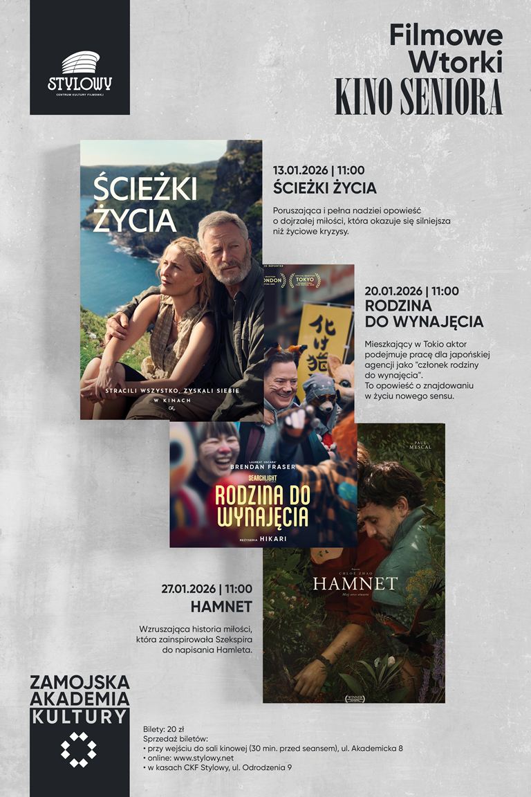 dodano: 09.01.2026Kino na zamojskiej starówce? Zamojska Akademia Kultury zaprasza Seniorów na dedykowane im seanse filmowe. W repertuarze najnowsze produkcje filmowe, poprzedzone wideoprelekcją. To kino bez popcornu i reklam, z premierowym repertuarem. Projekcje filmowe odbywają się we wtorki o godzinie 11:00, w sali kinowej Zamojskiej Akademii Kultury, ul. Akademicka 8, II piętro, wejście od ul. Akademickiej i Pereca (winda).