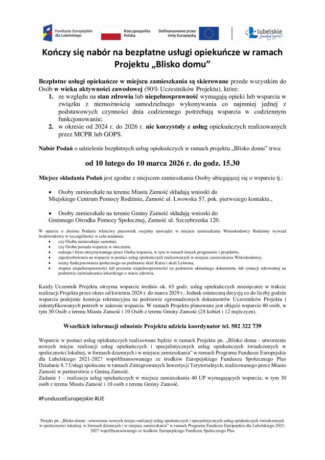 Wsparcie w postaci usług opiekuńczych realizowane będzie w ramach Projektu pn. „Blisko domu - utworzenie nowych miejsc realizacji usług opiekuńczych i specjalistycznych usług opiekuńczych świadczonych w społeczności lokalnej, w formach dziennych i w miejscu zamieszkania” w ramach Programu Fundusze Europejskie dla Lubelskiego 2021-2027 współfinansowanego ze środków Europejskiego Funduszu Społecznego Plus Działanie 8.7 Usługi społeczne w ramach Zintegrowanych Inwestycji Terytorialnych, realizowanego przez Miasto Zamość w partnerstwie z Gminą Zamość.